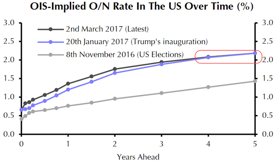 While the markets have accepted higher Fed Funds rates over the next couple of years, longer-dated rate expectations have not budged since January 20th. This would seem to suggest that while a near-term boost in growth (and inflation) is likely, confidence in long-term economic expansion remains muted.